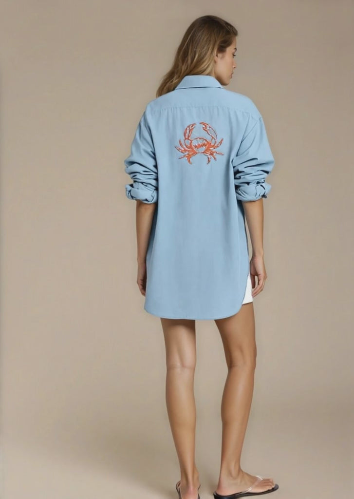 What makes the Nacida truly special? The hand-embroidered orange crab motif placed beautifully on the back, bringing a playful yet sophisticated touch to the crisp blue fabric. This intricate detail adds texture, personality, and a story worth telling—a nod to coastal living and the beauty found in the details.